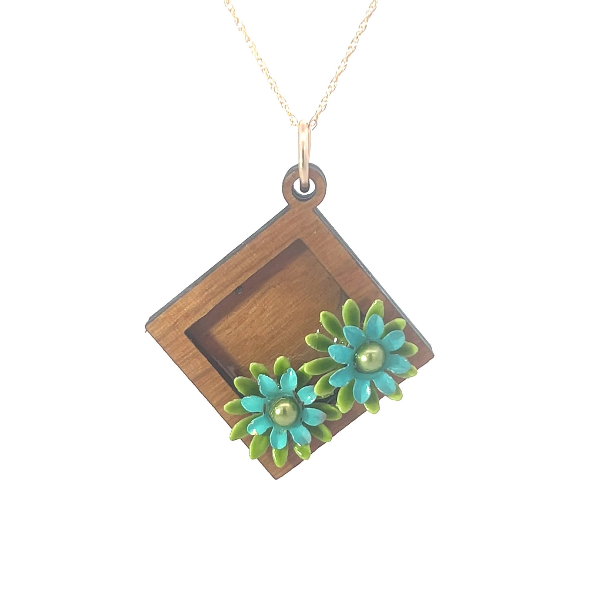 This floral wooden pendant necklace in cherry hardwood layers vintage green and blue enameled flowers into a strikingly modern, asymmetrical design. Vintage gold beads in the flower centers add elegant bright points to this unique, handcrafted piece.