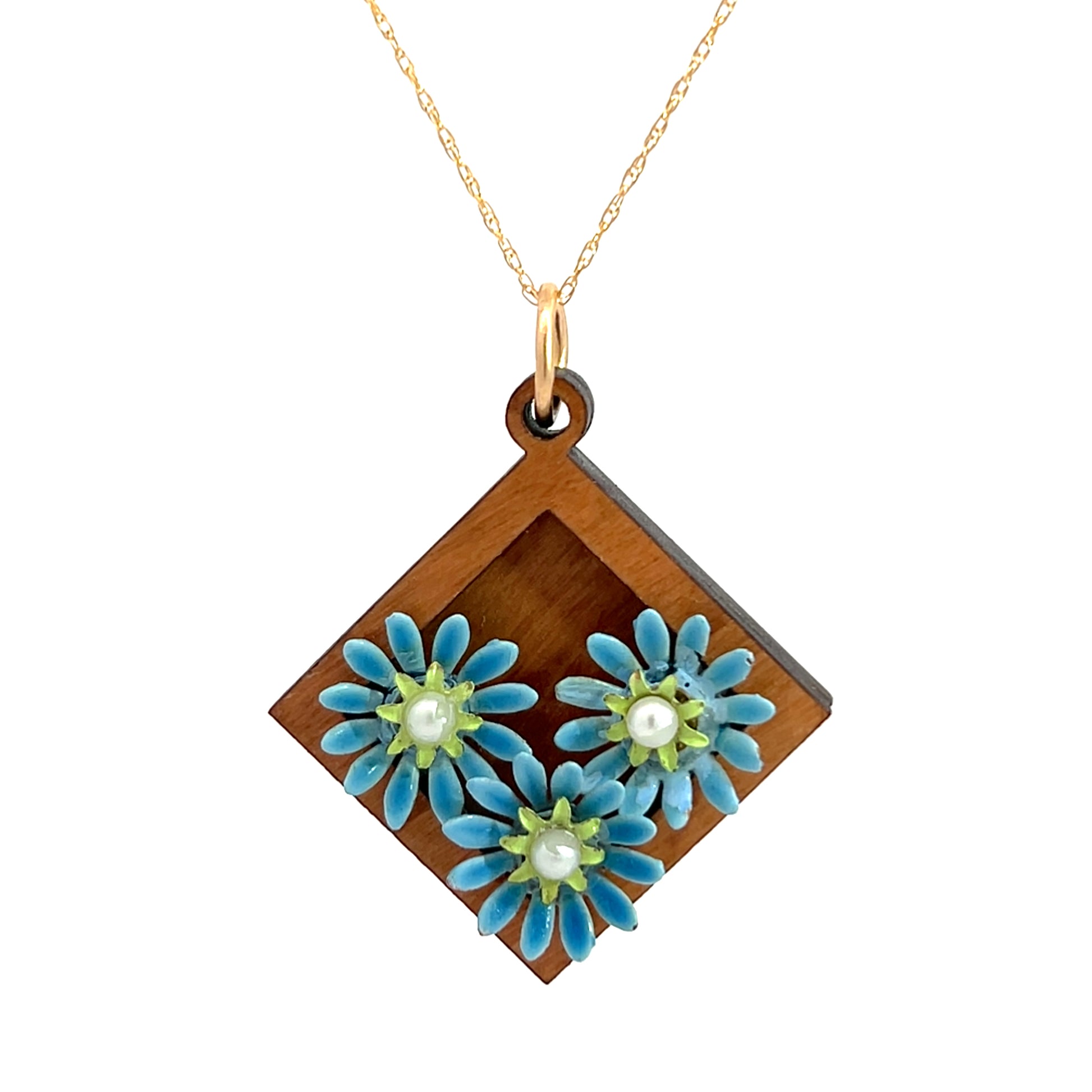 This stunning wooden pendant necklace in cherry hardwood features vintage blue enameled daisies with smaller green blossoms. Vintage pearls highlight the intricate design of this handcrafted piece.