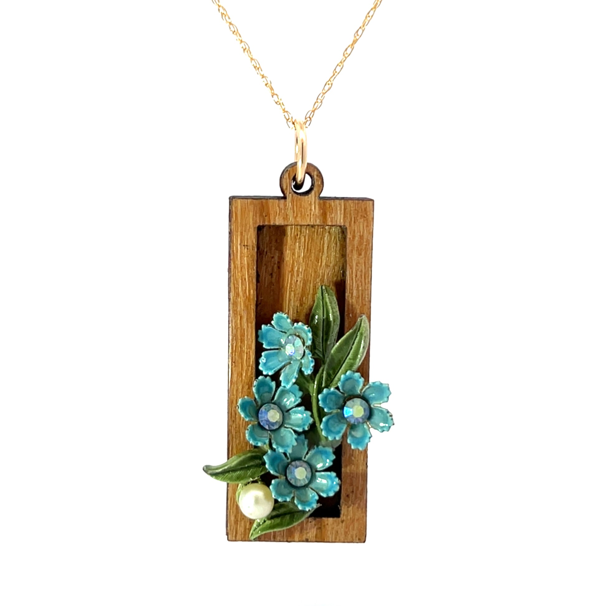 This exquisite floral wooden pendant necklace in cherry hardwood showcases a delicate spray of vintage blue enameled blossoms with sparkling crystal centers. Lush green leaves and a vintage pearl enhance the elegance of this striking piece.