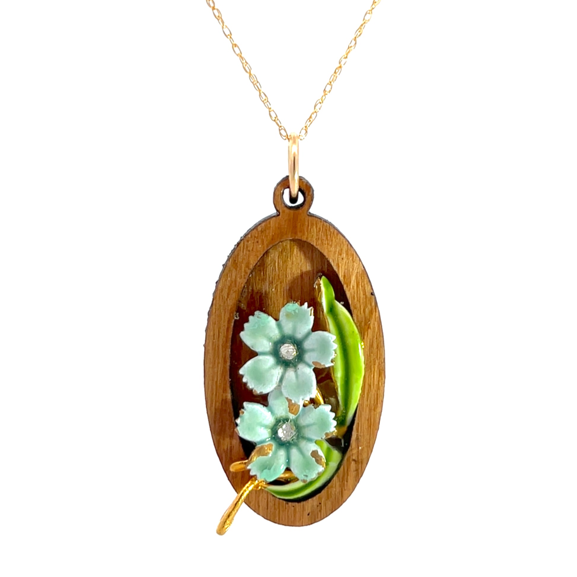 This gorgeous floral wooden pendant necklace in cherry hardwood features vintage enameled light blue-green blossoms with crystal centers. Lush green leaves and gold accents add to the beauty of this one-of-a-kind handcrafted piece.