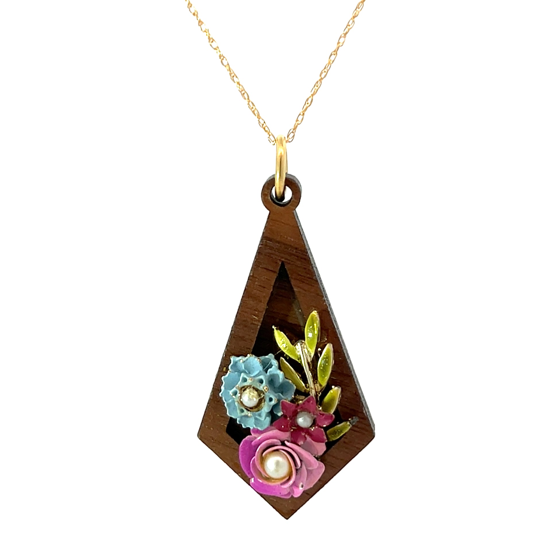 This Stunning floral wooden pendant necklace in walnut hardwood combines vintage enameled delicate flowers in shades of blue, purple and mauve with vintage dainty pearl centers. The addition of a vibrant green leaf accent adds to the beauty of this handcrafted statement piece.