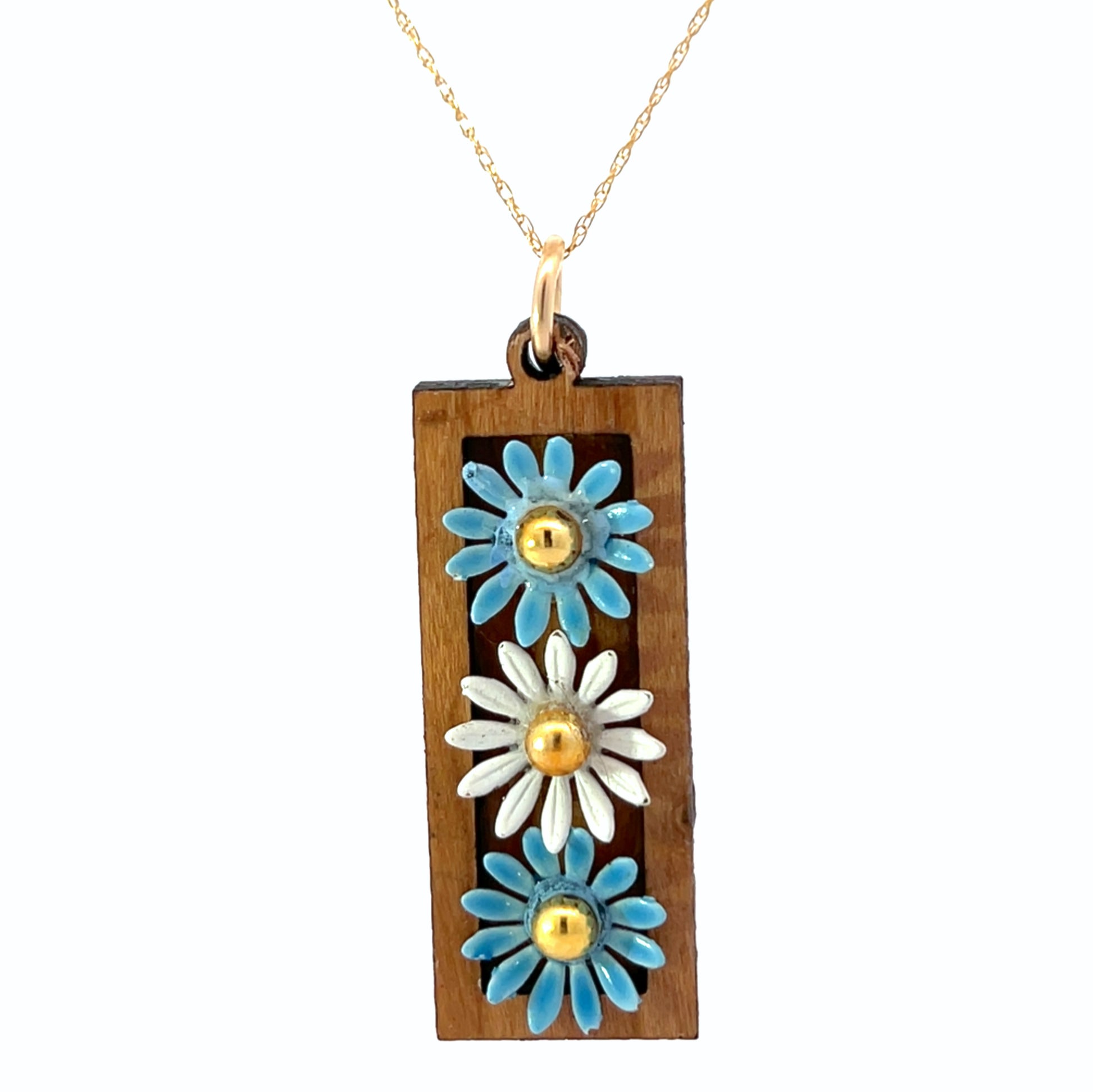 This exquisite floral wooden pendant necklace in cherry hardwood features vintage vibrant blue and white enameled daisies. The golden accent beads add a touch of elegance, making it the perfect accessory for any occasion.