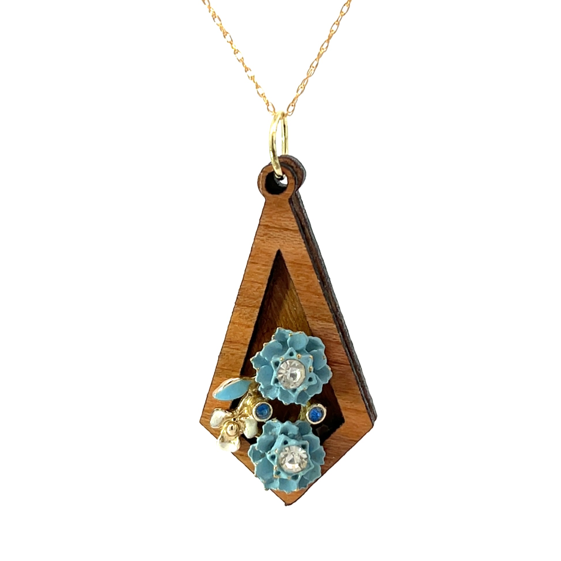 This gorgeous floral wooden pendant necklace in cherry hardwood combines vintage enameled delicate blue flowers with a white blossom. Golden accents and sparkly crystals add elegance to this artistic piece.