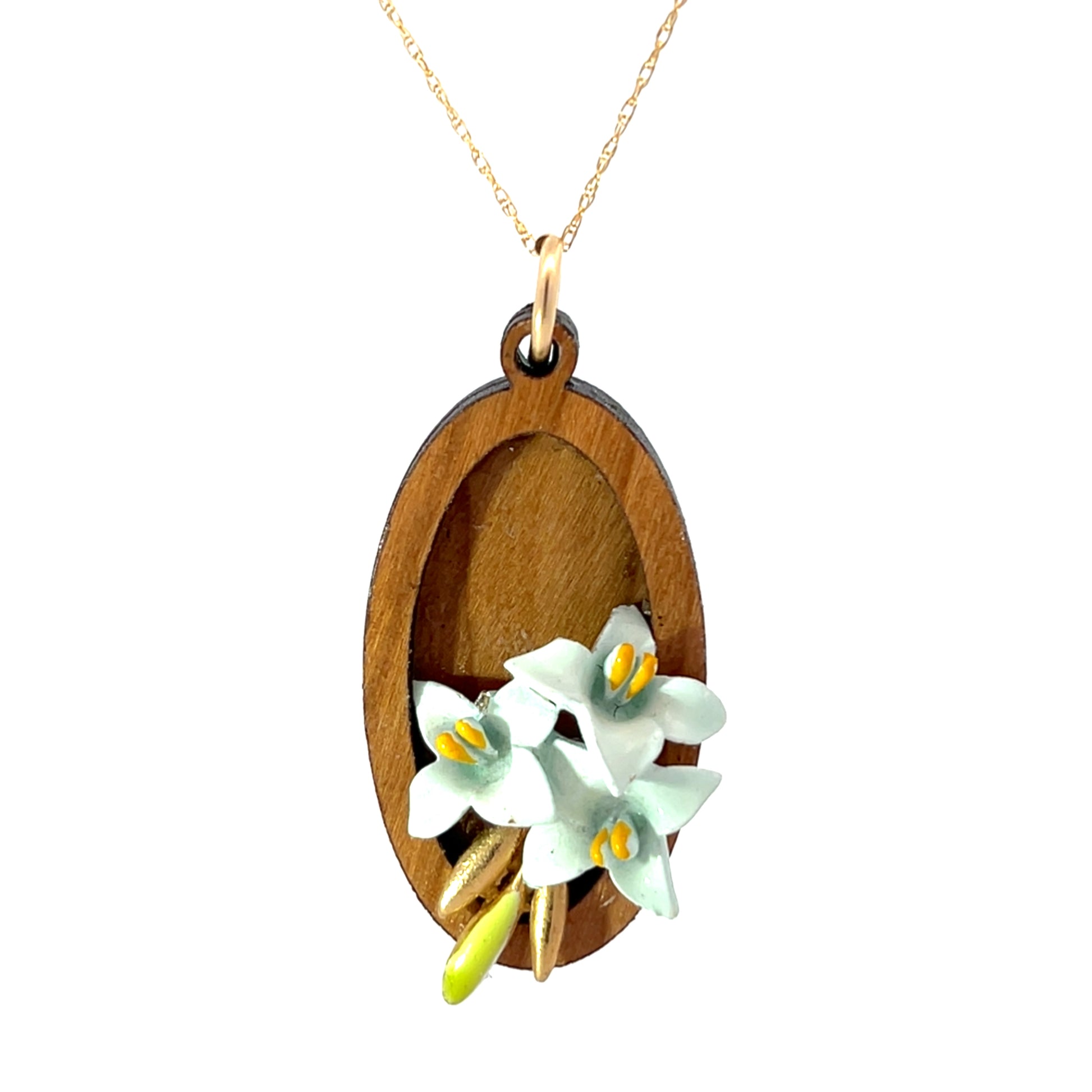 This exquisite floral wooden pendant necklace in cherry hardwood showcases enameled light blue flowers with vibrant yellow centers. This one-of-a-kind dimensional piece is accentuated by green and gold leaves.
