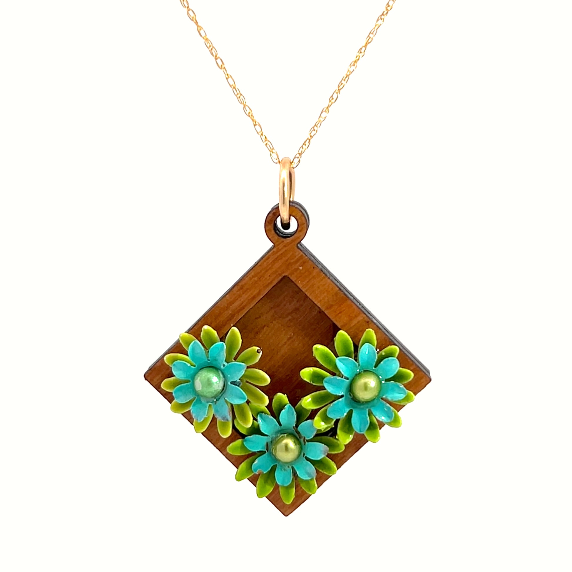This floral wooden pendant necklace in cherry hardwood layers vintage green enameled daisies with smaller teal blue blossoms. Vintage green pearl beads in the center of each flower combination create a bright and cheerful handcrafted piece.