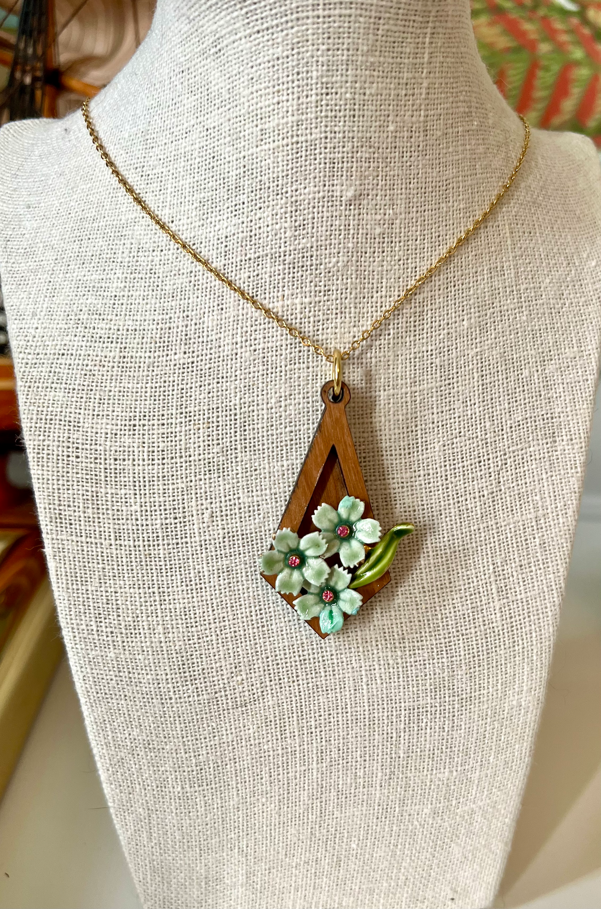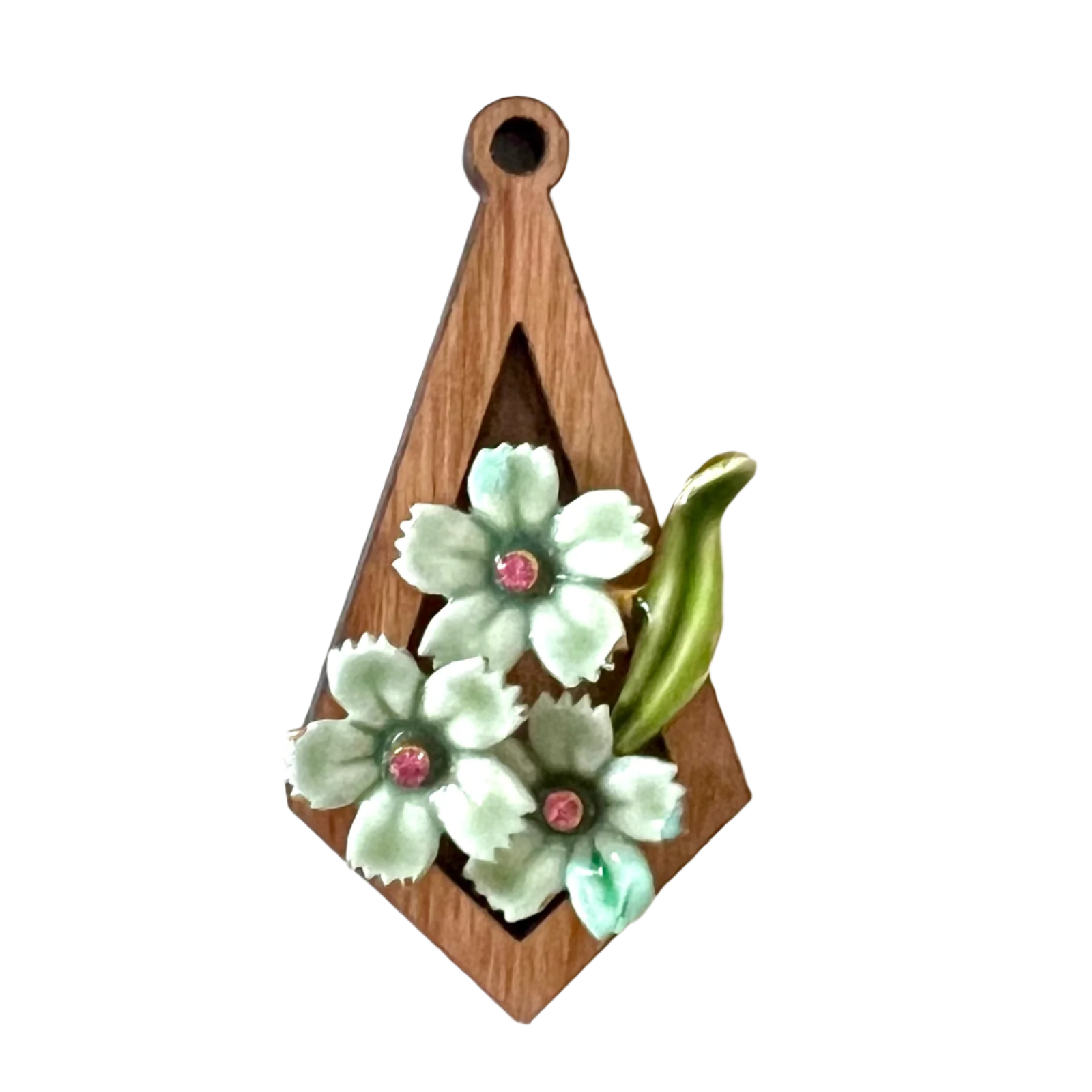 Three vintage green enameled flowers with pink rhinestone centers mounted on elongated diamond-shaped pendant in cherry hardwood.
