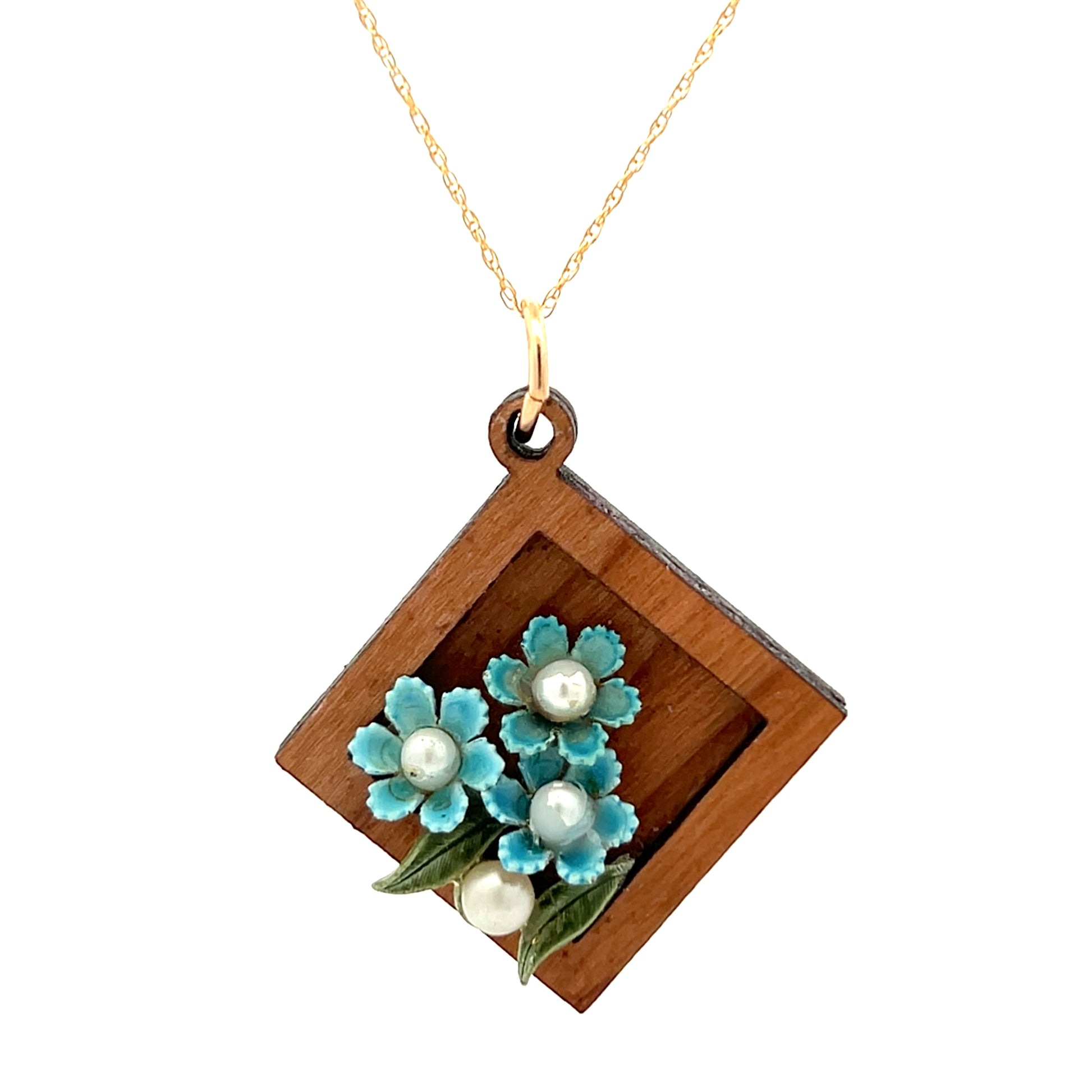 This delicate floral wooden pendant necklace in cherry hardwood features cheerful vintage light blue flowers set off with vintage pearl centers. Contrasting green foliage adds depth to this one-of-a-kind floral design.