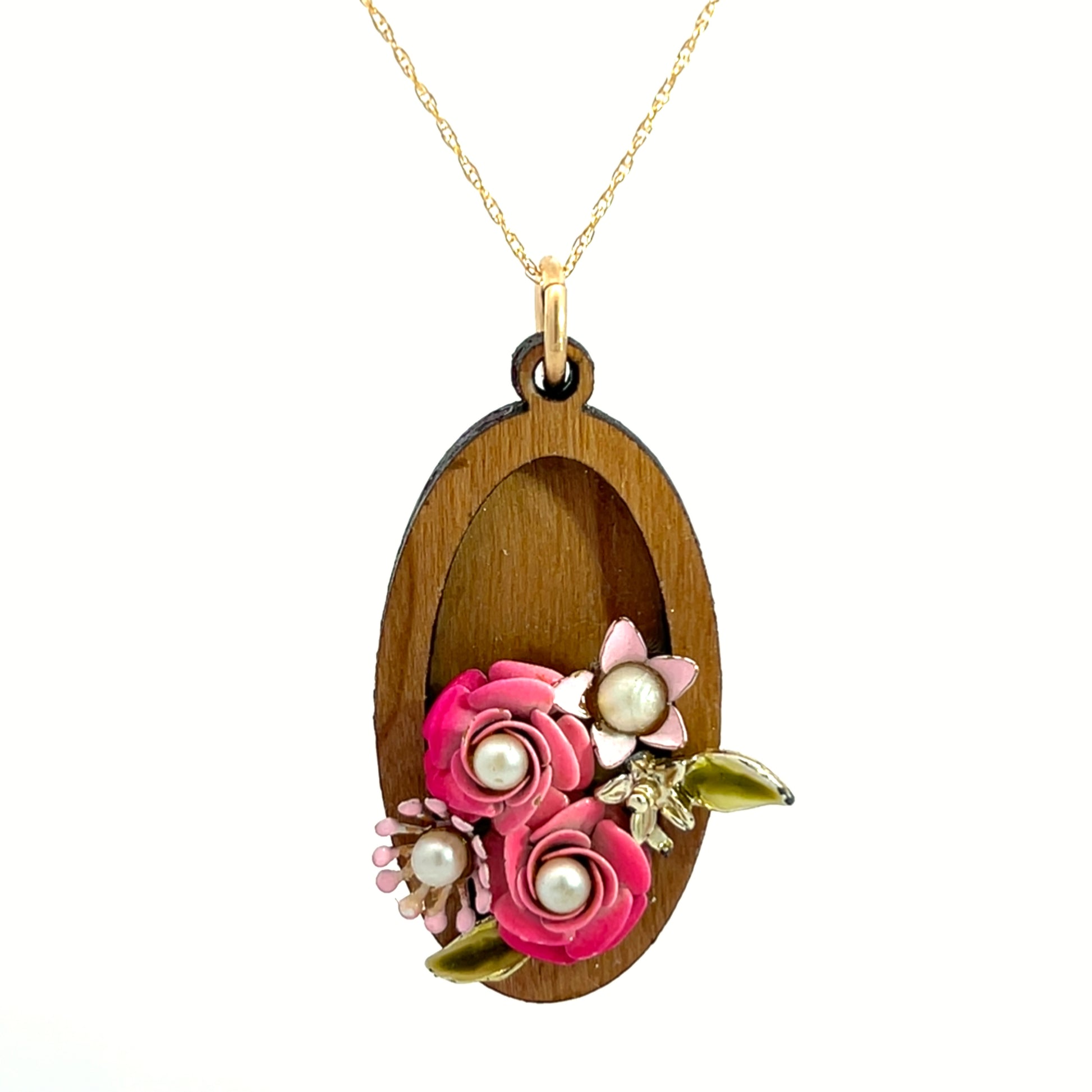 This beautifully crafted floral wooden pendant necklace in cherry hardwood features a pair of vintage enameled pink roses with lighter pink accent flowers. Delicate vintage pearl centers and green leaves provide contrast for a sophisticated, one-of-a-kind piece.
