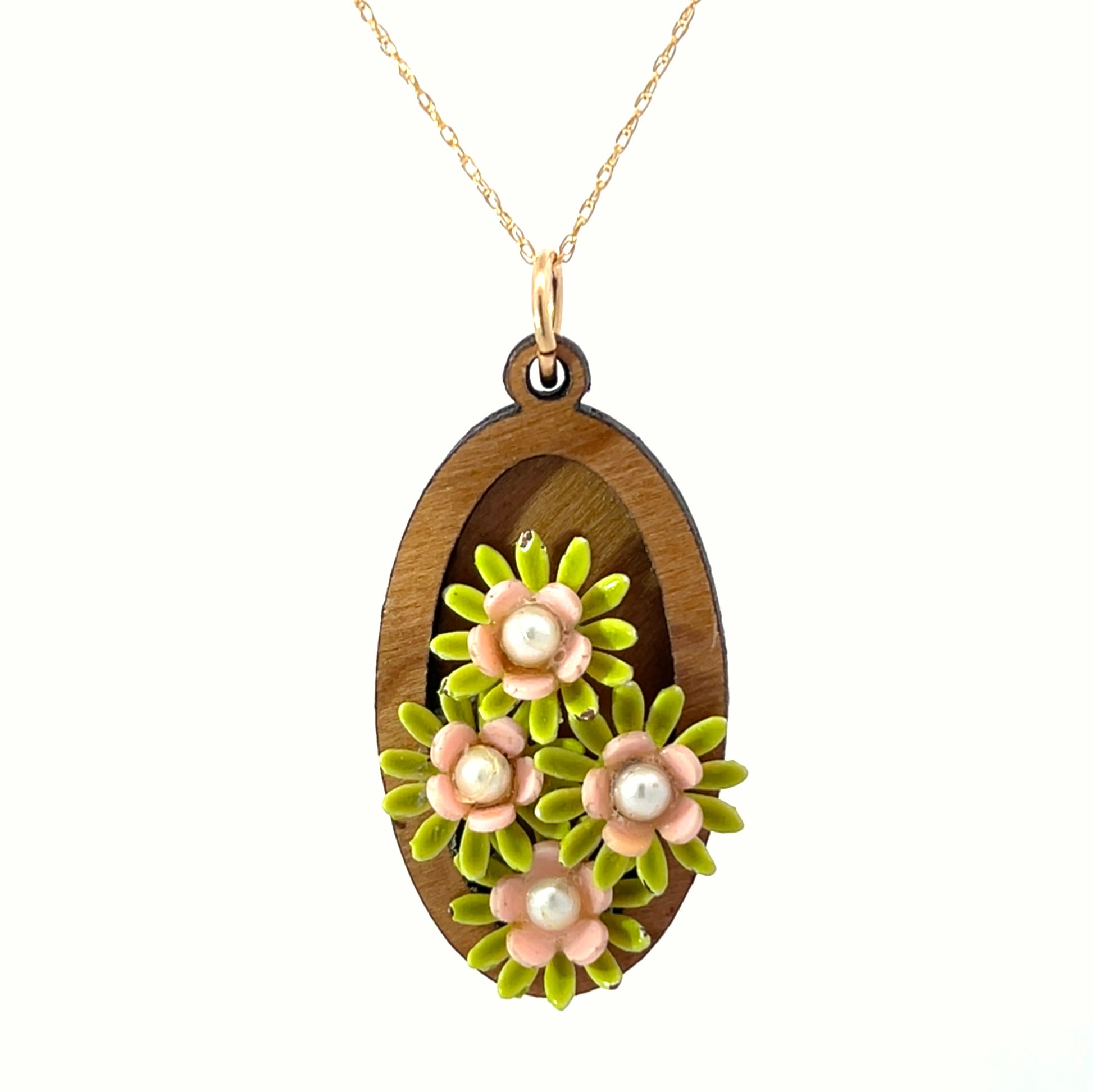 This lovely floral wooden pendant necklace in cherry hardwood layers vintage enameled green daisies with contrasting pink centers. Each flower is accentuated by delicate vintage pearls creating an elegant layered look to this one-of-a-kind piece.