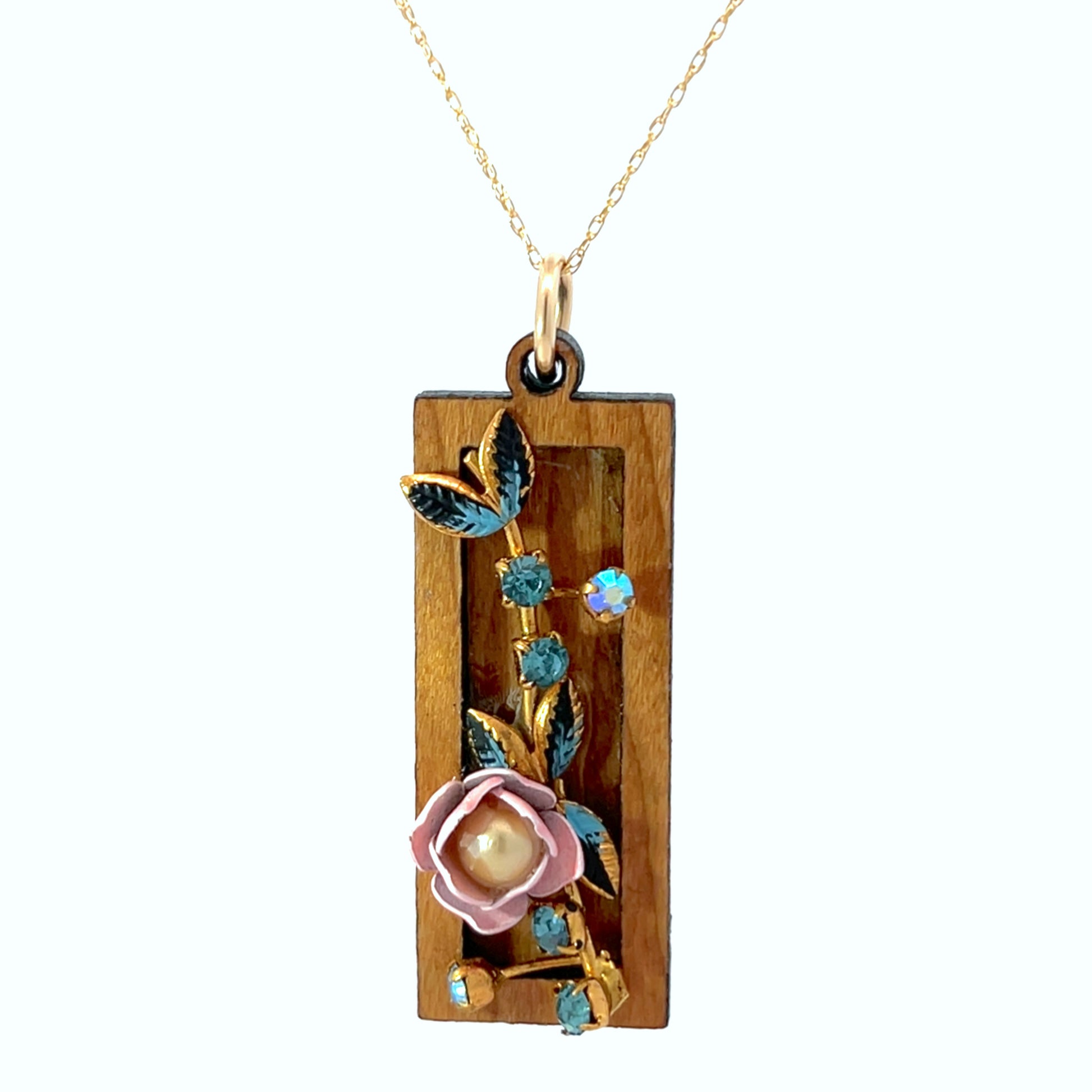 This stunning wooden pendant necklace in cherry hardwood features a vintage enamel pink rose with a vintage pearl center. The addition of a gold spray of vibrant blue leaves and crystals make this a striking piece that adds elegance to any wardrobe.