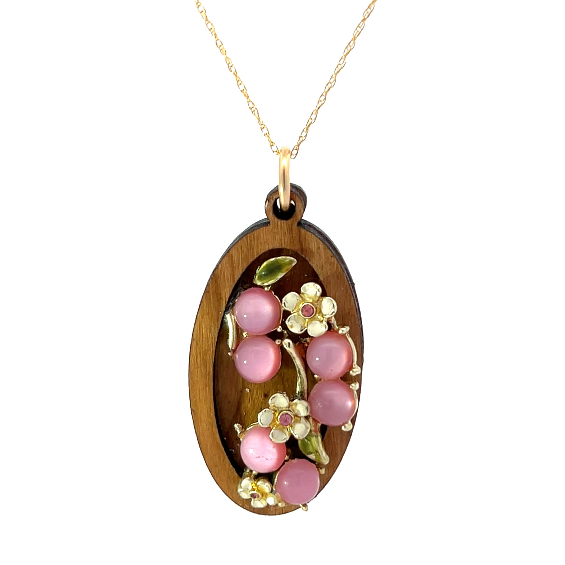 This exquisite floral wooden pendant necklace in cherry hardwood features an intricate design of enameled cream blossoms and bright pink cabochons. Gold details add elegance to this one-of-a-kind piece.