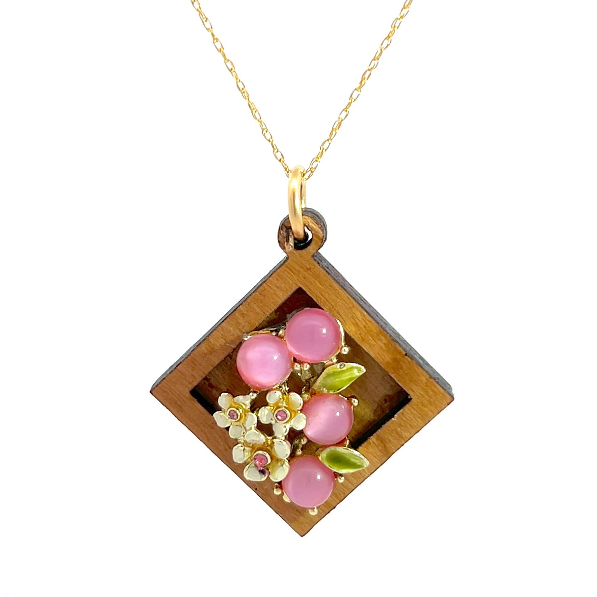 This stunning floral wooden pendant necklace in cherry hardwood combines vintage enameled cream blossoms with dainty green leaves and bright pink cabochons. This eye-catching piece adds elegance to any outfit.