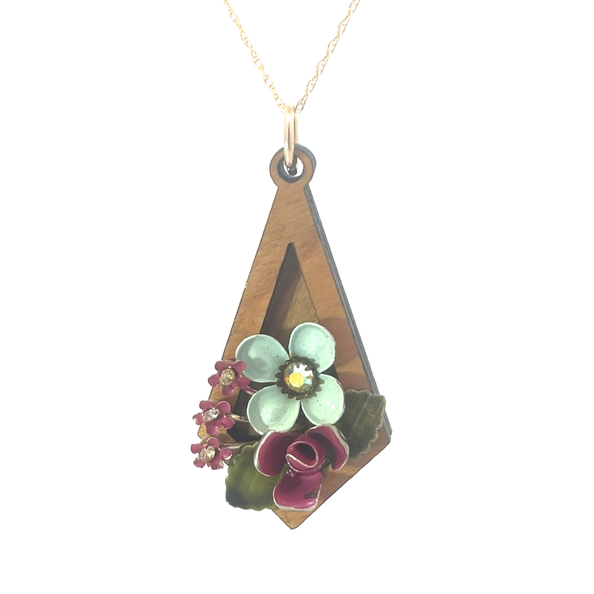 This elegant floral wooden pendant necklace in cherry hardwood unites a vintage enameled red rose with a delicate seafoam blue-green blossom and small rose red flowers, each with a vintage rhinestone center. Delicate gold accents and deep green leaves highlight the colors of this one-of-a-kind design.