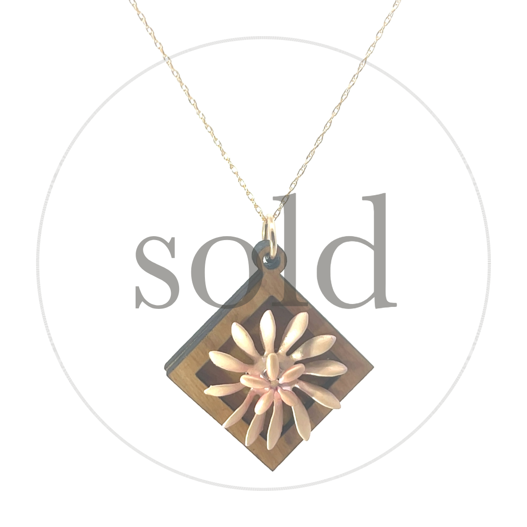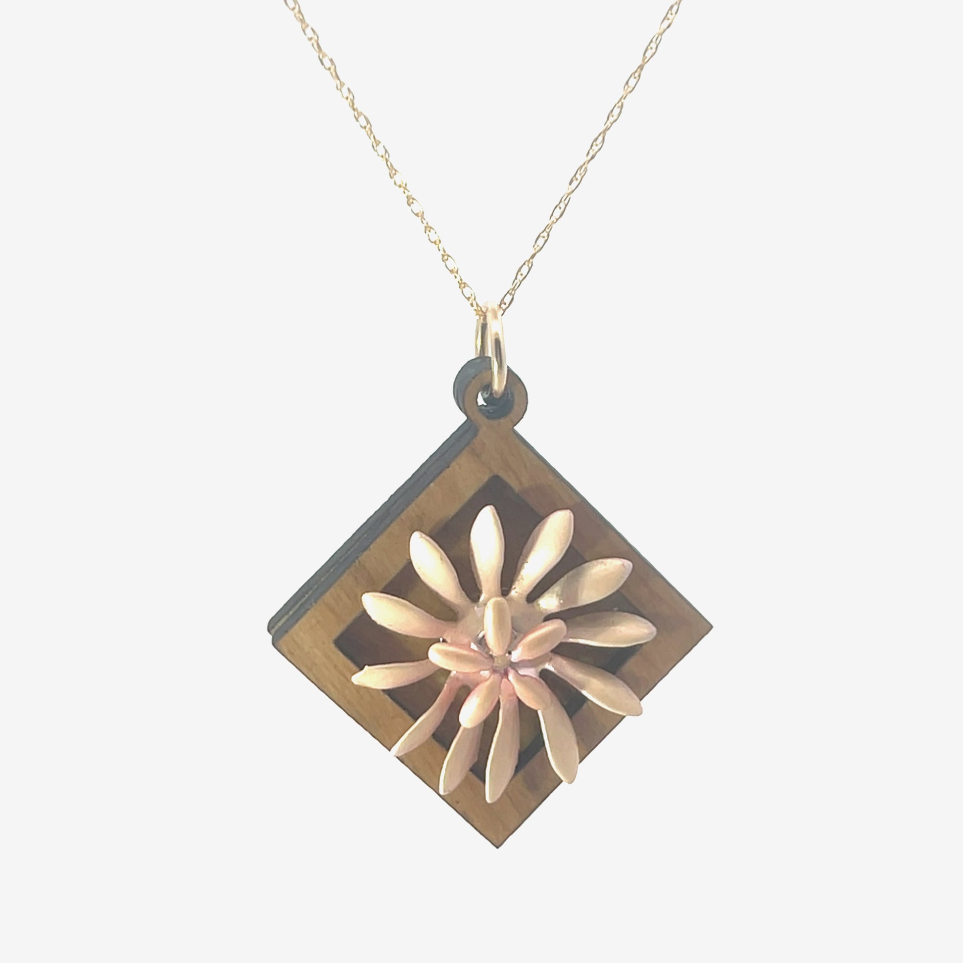 This one-of-a-kind wooden pendant necklace in cherry hardwood features a stacked set of vintage enameled floral elements in pale pink, creating a delicately modern abstraction that captivates the eye and creates an instant conversation starter.