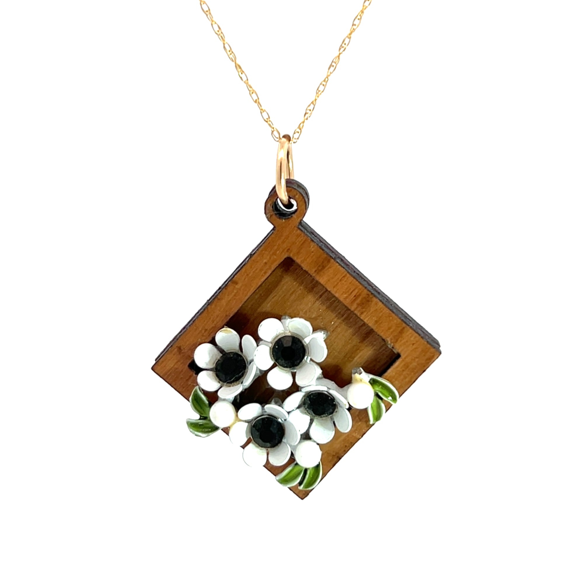 This delicate floral wooden pendant necklace in cherry hardwood features vintage enameled white flowers and dainty green leaves. Contrasting navy blue crystal centers add sparkle and depth to this elegant piece.