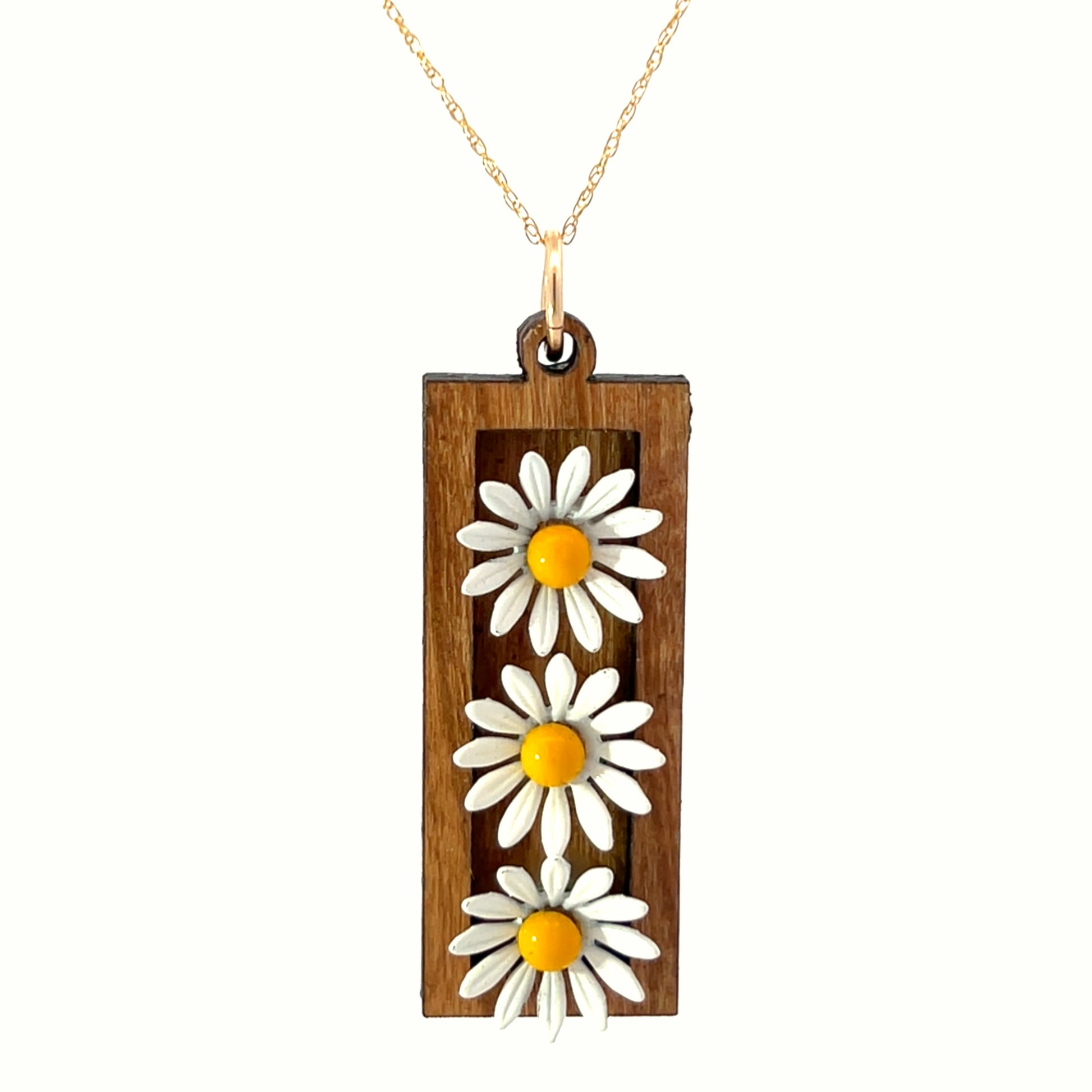 This charming floral wooden pendant necklace in cherry hardwood features 3 vintage enameled white daisies accentuated by vibrant yellow centers. This colorful piece will be a great addition to any wardrobe.